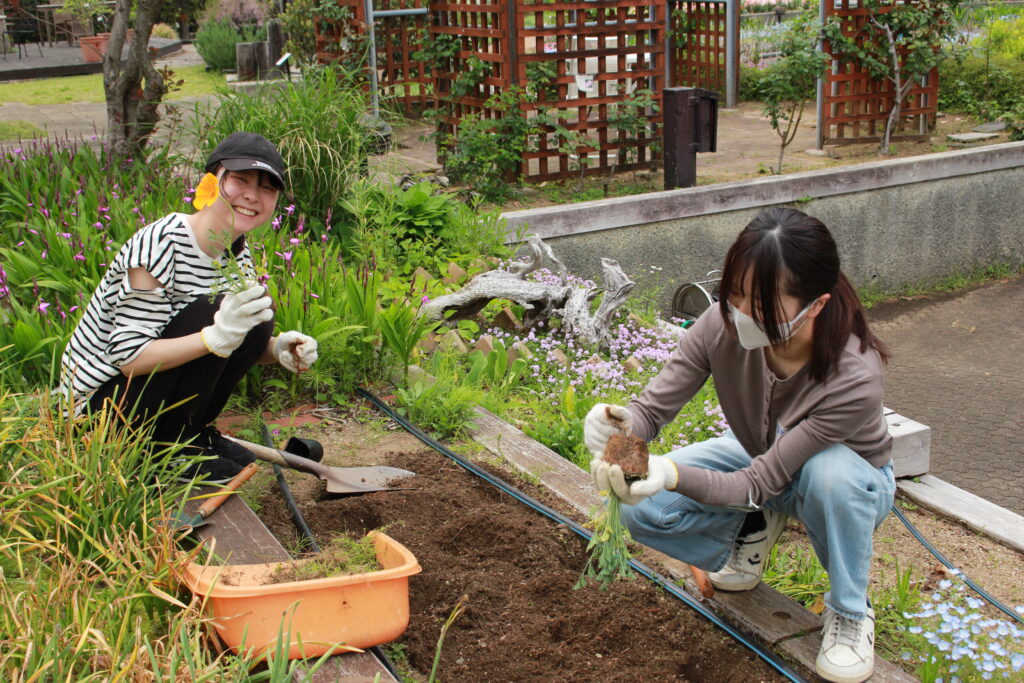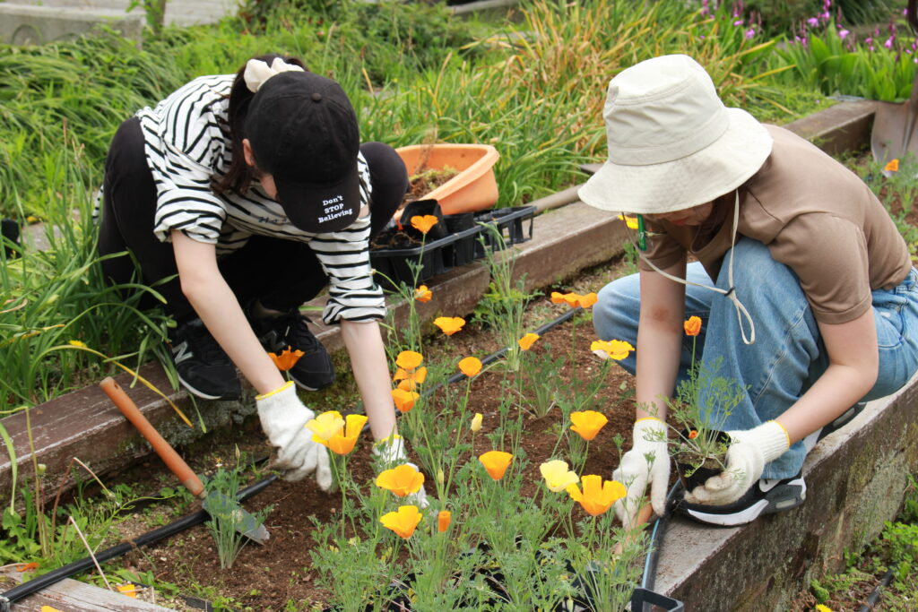 学生ボランティアさんたちに花壇にポピーの苗を植えてもらいました。