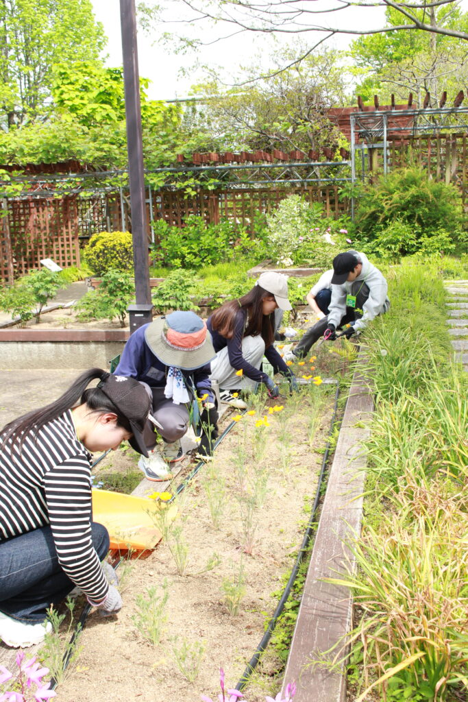 学生ボランティアさんたちに花壇のポピーのお世話と除草作業をしてもらいました。