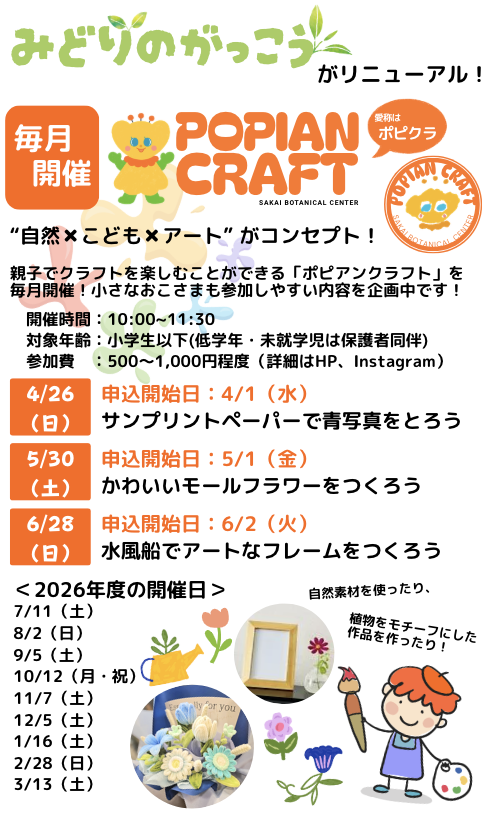 イベント トップイベントポピアンクラフト(旧:みどりの学校) 定期開催 2026年4月26日 開催 ポピアンクラフト(旧:みどりの学校) 前のイベントへ 一覧に戻る 次のイベントへ お気軽にお問合せください メールでの問い合わせ メールで問い合わせる 電話での問い合わせ TEL:072-247-0310 受付時間 通常期(3〜6月,9〜11月) 9:30〜17:00 夏 期(7月~8月) 9:30〜18:00 冬 期(12月~2月) 9:30〜16:30