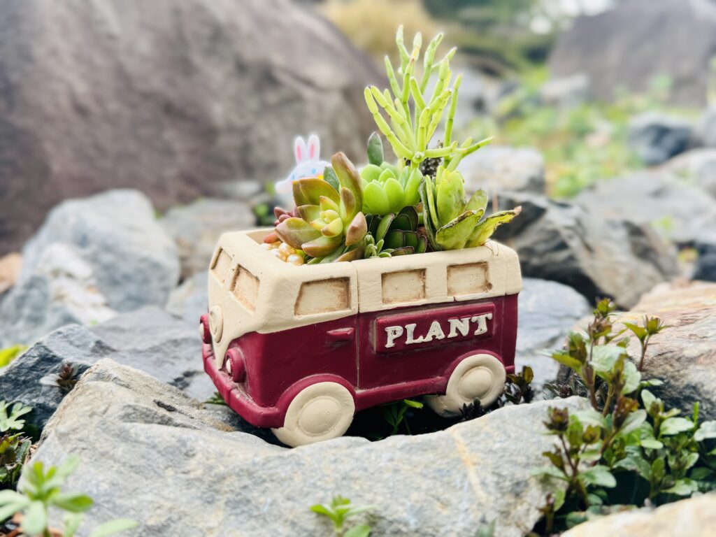 クラシックなワゴンカーの器に色々な多肉植物を植え込みます。