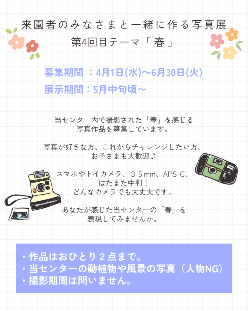 当センターで撮影した「春」を感じさせるとっておきの写真を募集いたします。