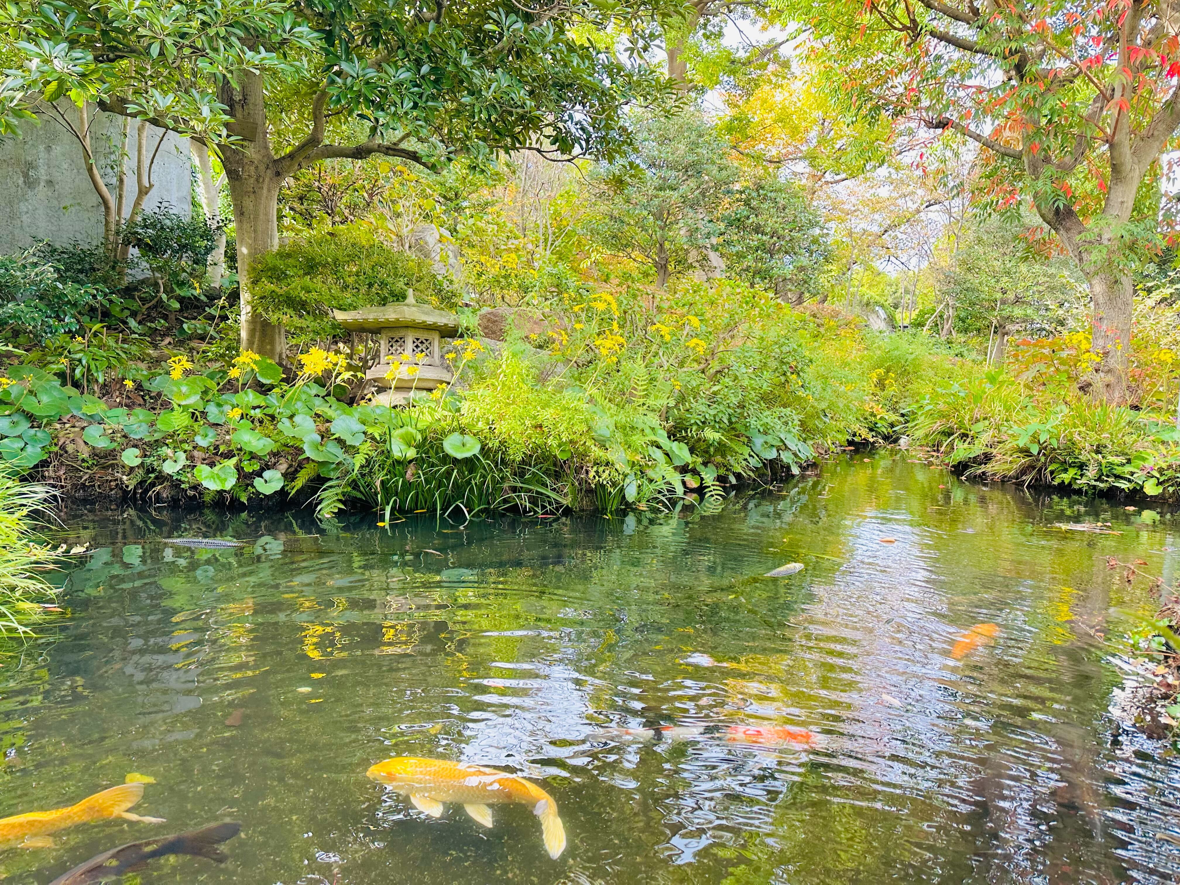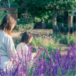 四季の庭では四季折々の花を楽しむことができます。吉祥の庭には縁起の良い植物が植えられています。